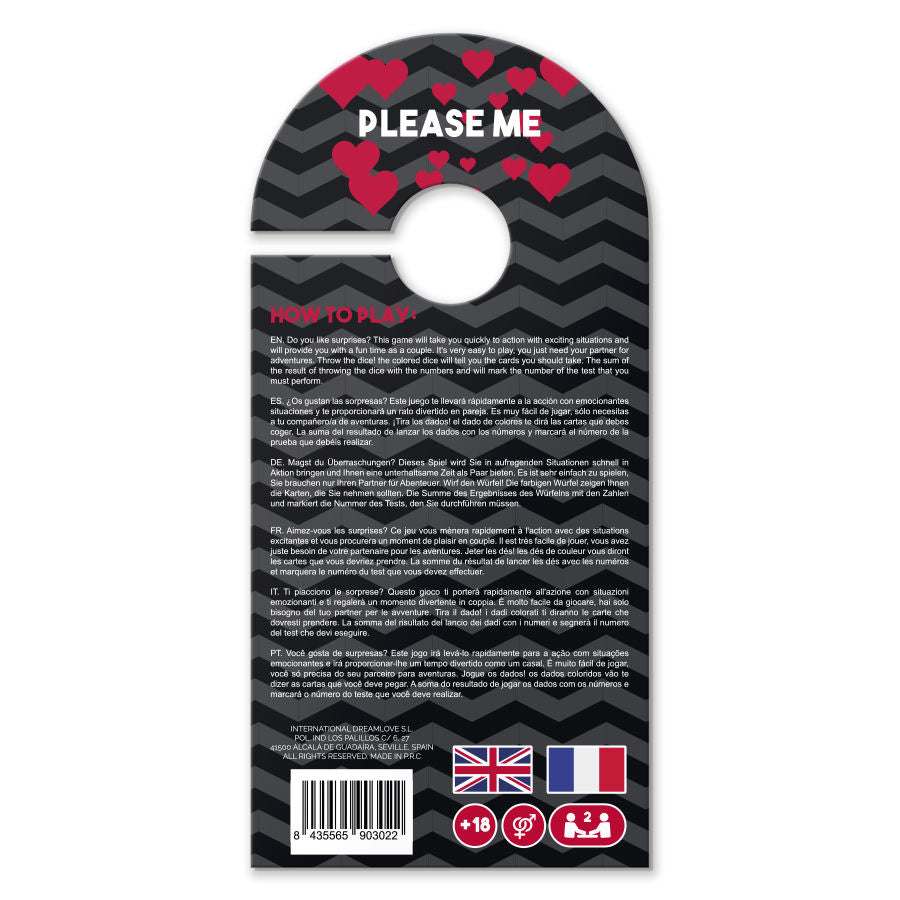 Você gosta de surpresas? Este jogo o levará rapidamente à ação em situações emocionantes e proporcionará a vocês momentos divertidos como casal. É muito fácil de jogar, você só precisa do seu parceiro de aventura. Jogue os dados! Os dados coloridos indicam as cartas que você deve pegar. O resultado soma de lançar os dados com os números e marcará o número da prova que você deve lançar.